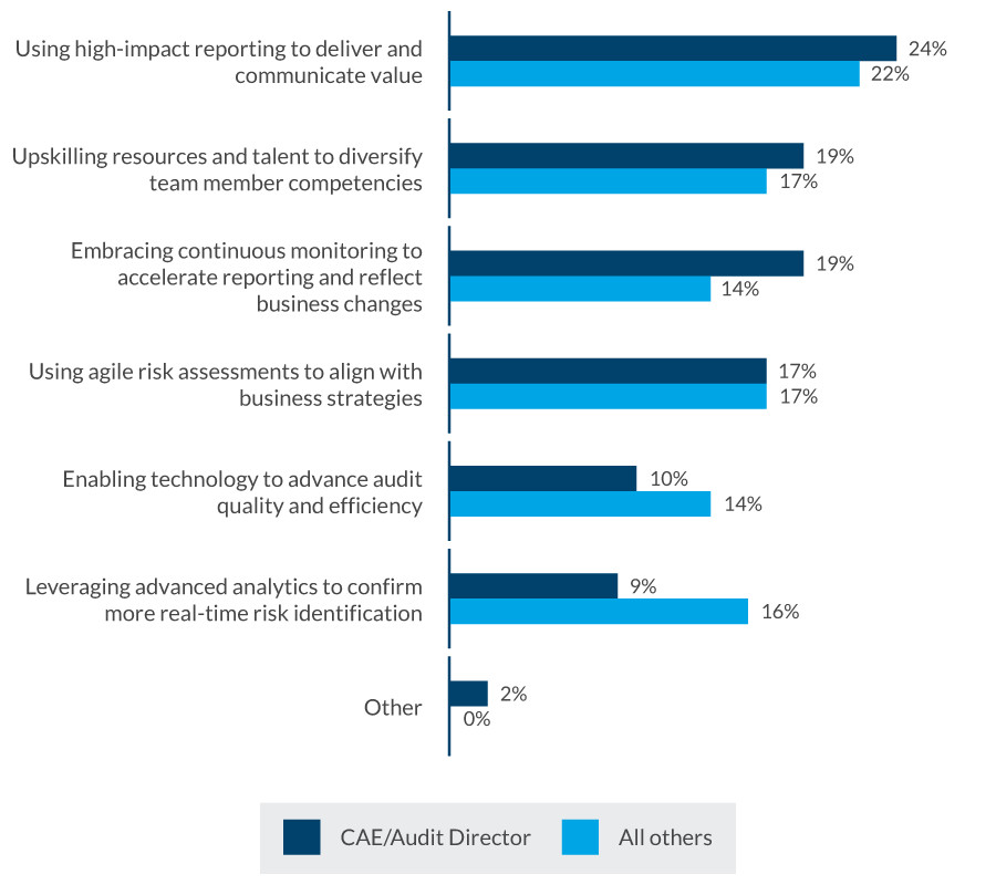 Impactful Communications When identifying the one factor that makes their internal audit functions relevant – or provides the most potential in delivering on the goal of relevance – the top choice among CAEs and internal audit leaders and professionals is high-impact reporting. While this finding punctuates the importance of impactful communications, there is more to the high-impact reporting story that internal audit leaders must recognise. Which one of the following areas do you believe contributes MOST to making an internal audit function relevant? What our research reveals Across all organisation types and internal audit maturity levels, using high-impact reporting to deliver and communicate value from and through internal audit’s activities stands out as the greatest contributor to what makes internal audit relevant in organisations. Within lower-maturity internal audit functions, there is greater need to upskill teams in high-impact reporting, and broader communication, capabilities. Reporting excellence hinges on the quality, timeliness and optimisation of most, if not all, activities and processes throughout the audit lifecycle. First, high-impact reports are not achieved through a single process. Instead, reporting excellence hinges on the quality, timeliness and optimisation of most, if not all, activities and processes throughout the audit lifecycle – including risk assessment, scoping/planning, project status, audit committee reporting, and issue follow-up and validation. High-impact reporting is about timeliness, as well as both form and content, customising the reporting communication to the audience to ensure stakeholders ranging from control operators to executives and board members have the information they need, when they need it, to allow for quick and quality analysis and decision-making. Increasingly, we are seeing reporting formats that heavily leverage data – these create more dynamic ways of interacting with report data and other content. Second, high-impact reporting should extend beyond audit reports to all other internal audit communication touchpoints, including planning memos, status checkpoints, advisory and consulting activities, audit committee decks, executive summaries, and risk assessment reporting. Internal audit groups with leading reporting capabilities also call on the foundational enablers of high-impact reporting – relevance, risk-centeredness, conciseness and insightfulness – in their verbal communications with stakeholders throughout their organizations. Relevant reporting and communications require deep considerations of multiple stakeholder groups and customized messages and communication modes that address the unique needs of each of those groups and are provided timely to allow for analysis and decision making. Risk-informed reporting and communications require internal audit to be dialed into those risks – and objectives – that are important to the organisation. Dynamic risk assessments can be used to gain insights into these risks, which often link to the execution of the organization’s business strategy, operations, compliance activities and financial goals, enabling internal audit to audit at the speed of risk Concise reporting and communications require internal audit groups to rethink the way their messages are developed and delivered – with a mindset of “How do I say more, with less?” and “What are the absolutely critical pieces of information we must communicate?” These reassessments generate innovations that make better use of data and visual appeal, which helps get messages to key stakeholders quicker and more clearly. Insightful reporting and communications do more than inform executives and other stakeholders of what they already know by conveying new perspectives, analyses and suggestions. Generating fresh insights requires new approaches and tools throughout the internal audit lifecycle, including advanced automation, dynamic risk assessments, agile audit techniques and process mining, together with appropriate data access and governance. Digitally proficient, Next-Generation Internal Audit groups are more likely to create high-impact reports. These leaders are also more likely to apply the four high-impact reporting enablers throughout the audit cycle. Making risk assessment activities insightful requires asking what the assessment is telling us that is new or has changed in a notable way, for example. If reporting is to be risk-informed at the audit committee level, audit leaders must continually ask whether those reports align to the organisation’s most critical risks and provide the risk insight that audit committee members require. The bottom line: Our research shows that internal audit leaders should prioritise developing impactful communications to elevate their relevance in the organisation. Back to survey home Explore the results of our research Pro Document Consent Building Internal Audit’s Relevance CAEs and internal audit leaders view high-impact reporting and, more broadly, impactful communications as the top driver to establishing and building internal audit's relevance with the board, senior executives and other stakeholders. Pro Document Folder People and Talent A host of talent and skills-related issues represent significant challenges, and opportunities, for CAEs and internal audit leaders and their teams. Pro Location Globe Impactful Communications When identifying the one factor that makes their internal audit functions relevant, the top choice among CAEs and internal audit leaders and professionals is high-impact reporting. Pro System Security Use of Technology Investments in advanced analytics, machine learning, AI, process mining, automation, and other uses for data and enabling technology are key drivers of internal audit transformation. Detailed findings Assessing Next-Generation Internal Audit Maturity Levels View the maturity ratings for CAEs/Audit Directors and other